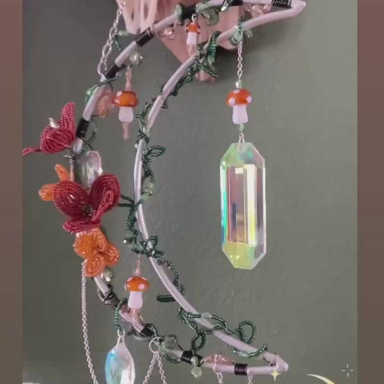 A crescent moon wrapped in creeping forest vines, blooming with hand-beaded amber florals and tiny enchanted mushrooms. Suspended crystal prisms catch the light like morning dew in a hidden woodland grove, scattering soft rainbows wherever they hang.