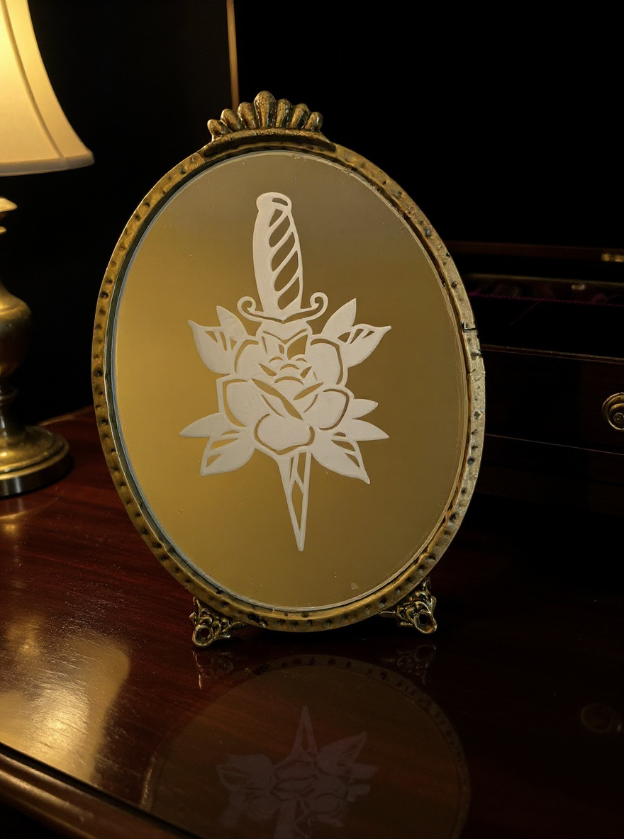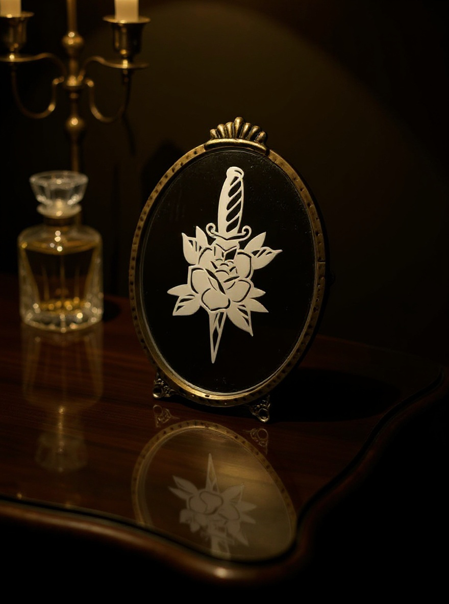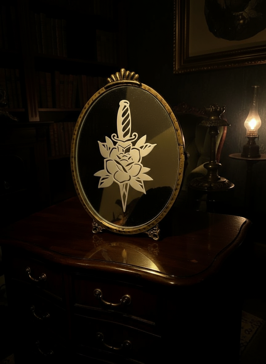 A haunting fusion of beauty and danger, this etched mirror captures the timeless symbolism of the dagger and the rose — love entwined with peril. Each line is etched into glass, revealing a striking design that glows softly under candlelight. Set within an ornate vintage-style frame, this piece evokes the allure of antique elegance and the edge of rebellion. A perfect statement for dark romantic spaces, it embodies the balance between grace and strength — fragile, fierce, and eternally captivating.