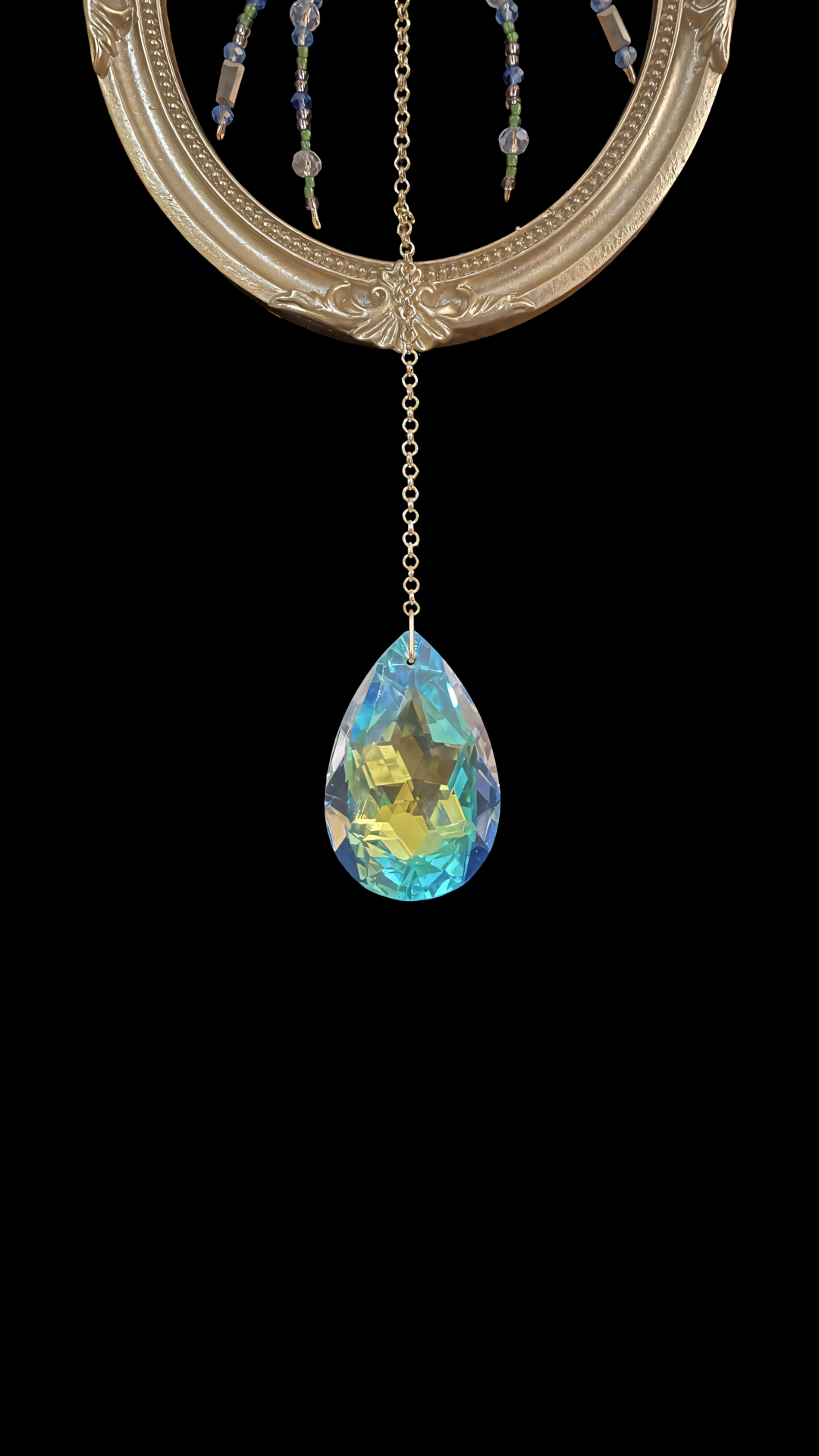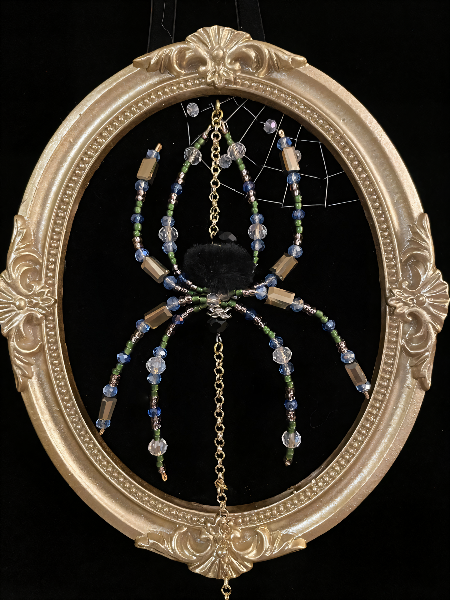 Encased in an ornate golden frame, The Gilded Widow weaves her web of elegance and mystery. Handcrafted with delicate glass beads and shimmering metallic accents, the spider rests at the center of her intricate beaded web, suspended by a golden chain. A faceted crystal teardrop dangles below, catching stray light and scattering spectral reflections across the room.