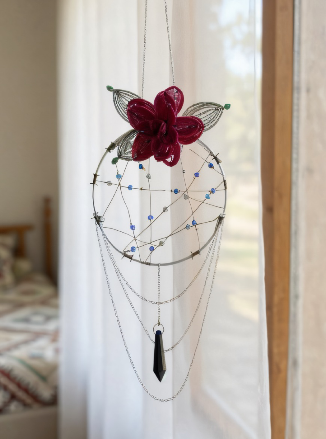 A hauntingly beautiful floral suncatcher, handcrafted with glass beads and ethereal blooms that shimmer like captured moonlight. Designed to bring a touch of dark romance and mystical glow to any space. ๐ฏ๏ธ๐นโจ