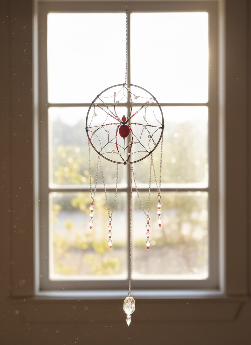 Handcrafted with intricate glass beads and a touch of shadowed charm, this spider suncatcher weaves beauty and darkness together. Each strand catches the light like a silken web, casting glimmers that feel both eerie and enchanting. Perfect for those who find elegance in the unusual. 🕷️✨